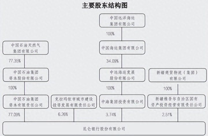 昆仑银行注册资本约102.88亿元,前五大股东依次分别是持股77.09%的中油资本、持股6.26%的克拉玛依城投、持股3.74%的中海集团投资公司、持股2.51%的新疆国资投资经营公司以及持股2.17%的新疆金融投资集团。
